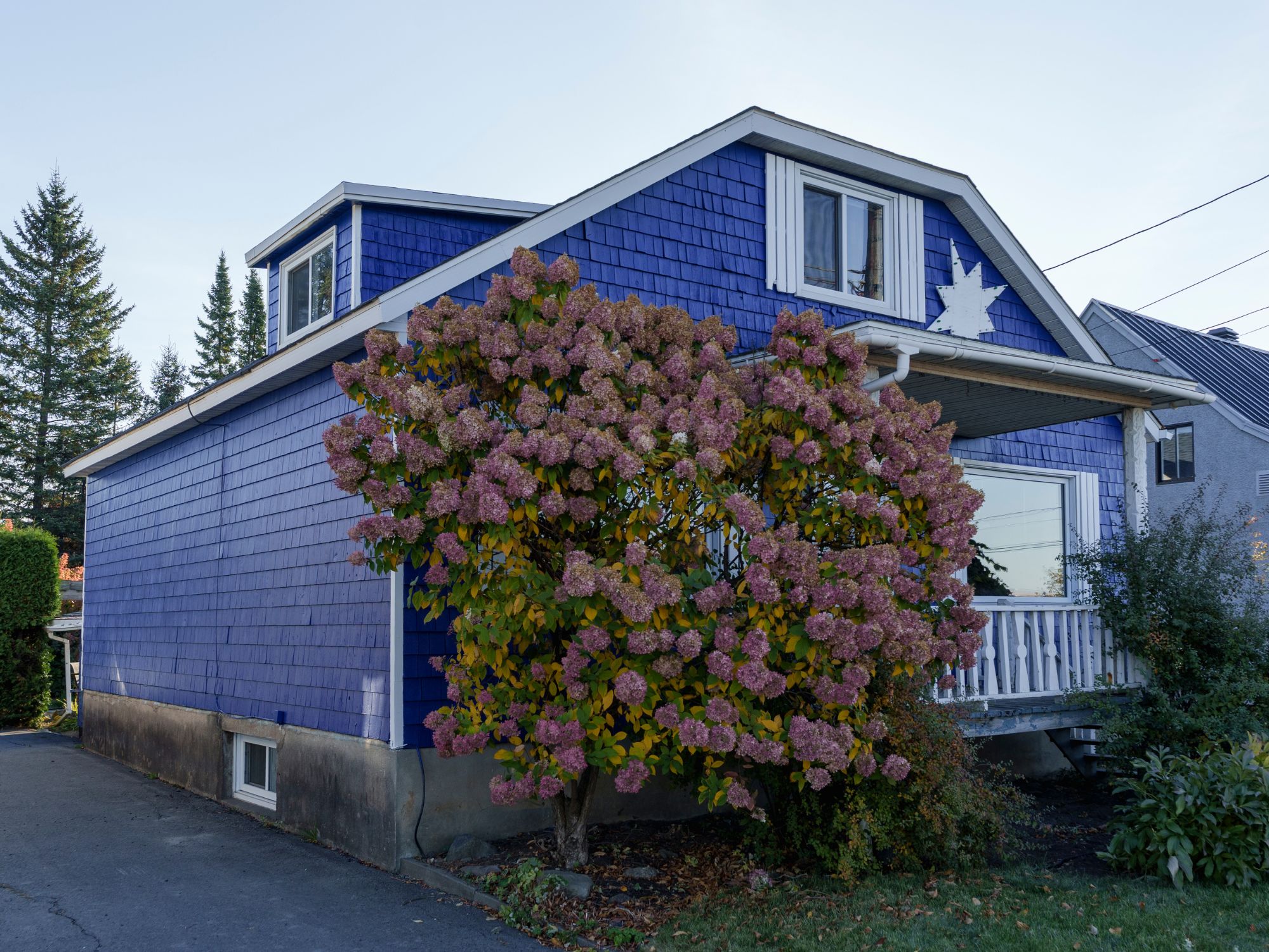 Peinture au spray d'un revêtement de bardeau de cèdre sur une maison ancestrale des Laurentides.